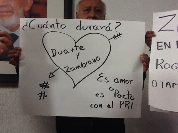 En otra cartulina resaltaba un corazón atravesado por una flecha y en su interior los nombres del Gobernador Javier Duarte y Jesús Zambrano, presidente Nacional del Partido de la Revolución Democrática (PRD) y a un lado la sentencia: “Es amor o es Pacto con el PRI”. Alrededor de unos 100 militantes, entre dirigentes estatales, fundadores y candidatos a puestos de representación popular para las elecciones de este 7 de julio, viajaron desde el estado porteño al Distrito Federal para encarar a Jesús Zambrano y exigirle cuentas por lo que está sucediendo con el Sol Azteca de su estado.
