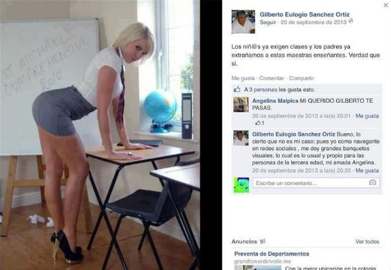 En una de esas fotos, publicada el 20 de septiembre de 2013, cuando en Oaxaca había un paro de labores en las escuelas públicas debido a las protestas de los maestros contra la Reforma Educativa, Sánchez Ortiz publicó la fotografía de una mujer que viste minifalda, recargada sobre un pupitre escolar. “Los niñas ya exigen clases y los padres ya extrañamos a estas maestras enseñantes. Verdad que si” (sic), publicó como comentario a la imagen.