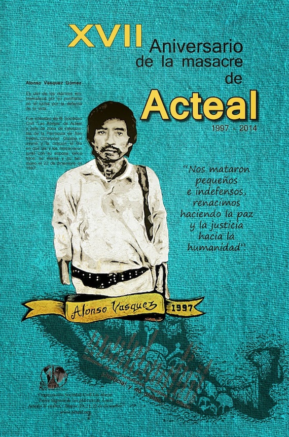 La organización hizo un llamado a la población en general a sumarse a recordar ese 22 de diciembre. “Es por eso que a los hombres y mujeres de buen corazón que también luchan por la justicia y contra la impunidad y que no están de acuerdo a que se repitan más masacres en nuestro México les invitamos a acompañarnos a la conmemoración del 17 aniversario de Acteal”, convocaron. Además invitaron a unirse a toda la gente del país e incluso del mundo, a través de audios, videos y fotografías en solidaridad con Acteal y que sean difundidos por las redes sociales con los hashtags #Acteal #NoALaImpunidad. “UN CONFLICTO ÉTNICO” La masacre de Acteal ocurrió en 1997 cuando un grupo armado asesinó a 45 indígenas tzotziles, entre ellos mujeres y 15 niños, quienes oraban al interior de una pequeña iglesia de la localidad en el municipio de Chenalhó, Chiapas.