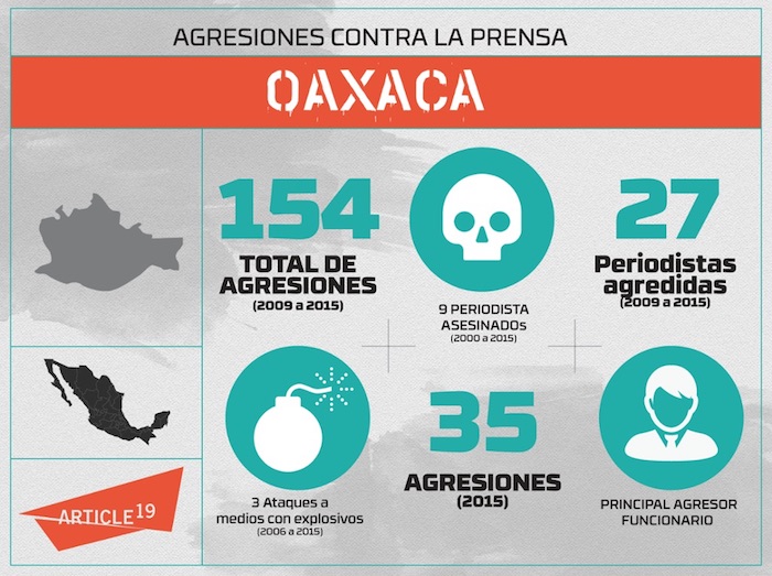 | En un comunicado, la organización recordó que el asesinato de Hernández Bautista es el quinto en lo que va de la administración del Gobernador Gabino Cué Monteagudo en Oaxaca. Gráfico: Artículo 19 |
