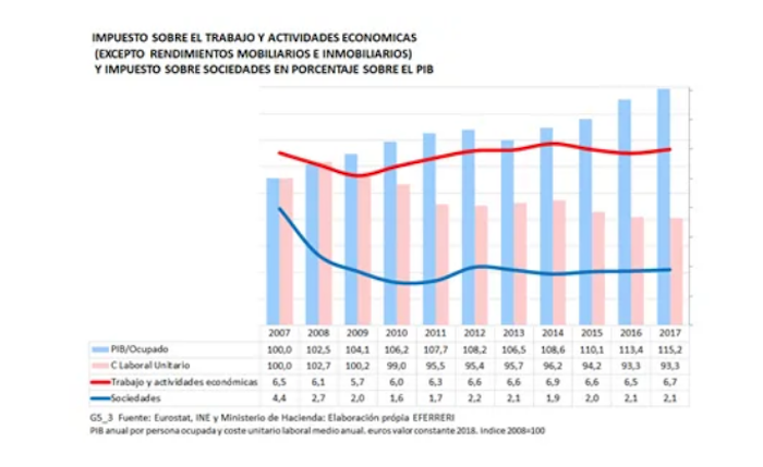 Por último, se produce una evolución regresiva entre los impuestos directos. La recaudación por impuestos que gravan el trabajo y la actividad económica no societaria (es decir el IRPF excepto las rentas de carácter mobiliario e inmobiliario) se mantiene estable: el 6,5 y el 6,7 por ciento del PIB en 2007 y 2017 respectivamente, con una recaudación de 80.191 millones euros y 78.801 millones respectivamente. Sin embargo, no ocurre lo mismo con la recaudación del impuesto de sociedades que durante el mismo período disminuye del 4,4 por ciento del PIB a solo el 2,1 por ciento, pasando la recaudación de 54.253 millones de euros el 2007 a 24.801 millones de euros en 2017.