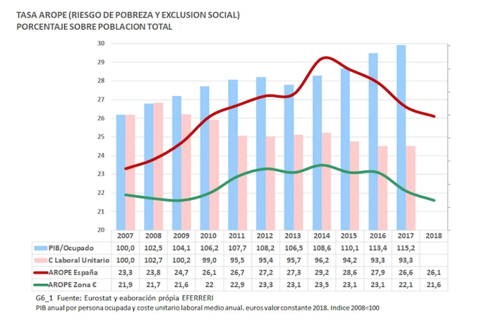 La segunda consecuencia es el aumento del riesgo de pobreza. La tasa AROPE (People at risk of poverty or social exclusión) es un indicador que mide la combinación de tres índices: a) la tasa de riesgo de pobreza, medida como aquellos ingresos situados por debajo de la mediana de ingresos; b) la tasa de privación material severa (PMI) que mide los hogares entre cuyas carencias figura la posibilidad de ir de vacaciones, la frecuencia con la que comen carne y la temperatura adecuada de la vivienda; c) tasa de hogares con baja intensidad en trabajo (BITH) que mide la población de entre 0 y 59 años que vive en hogares cuyos adultos (18-59) trabajan menos del 20% de su potencial de trabajo. La tasa AROPE nos proporciona una visión consolidada de los efectos de la evolución de la distribución de la renta y la riqueza antes comentadas. En 2007 la tasa AROPE en España era de un 23,3 por ciento de la población, en el noveno lugar en la ordenación de los países de Unión Europea de mayor a menor riesgo de pobreza. En 2017 esta tasa había aumentado hasta el 26,6 por ciento de la población, ascendiendo España hasta el quinto lugar, sólo por detrás de Rumania, Bulgaria, Lituania y Estonia.