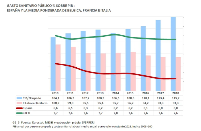 El gasto sanitario público en 2010, según los datos de Eurostat, ha descendido del 6,6 por ciento del PIB al 6 por ciento en 2018, año en el que la media ponderada de la misma relación de Bélgica, Francia e Italia era del 7,6 por ciento. El gasto sanitario público por habitante en 2018 fue de 1.451 euros, frente a 2.500 euros de media ponderada de Bélgica, Francia e Italia, es decir un 58 por ciento de la media de dichos países. Esta proporción no es coherente con la capacidad económica relativa de España medida como PIB por habitante, que se sitúa en el 78 por ciento de la media de estos países.