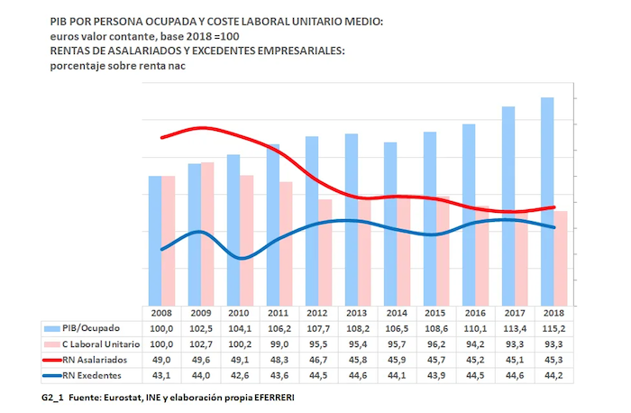 Volviendo a Víctor Hugo y respecto al primer problema que señala, entre 2008 y 2018, según el INE y Eurostat, el PIB por persona ocupada, medido en euros de valor constante 2018, ha aumentado el 15,2 por ciento. Esta evolución contrasta con la del coste unitario laboral medio anual, el cual, durante este período se ha reducido el 6,7 por ciento, reflejo del impacto de la desregulación laboral y de la devaluación salarial.