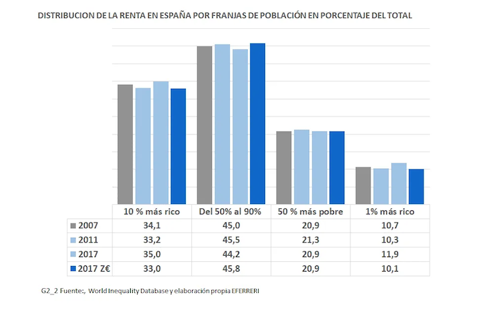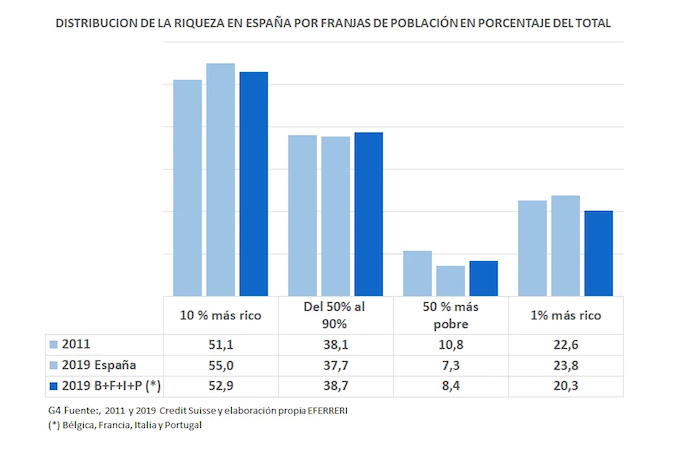 Según el informe Global Wealth Databook de Credit Suisse el 10 por ciento de la población más rica de España detentaba en 2019 el 55 por ciento de la riqueza, proporción superior al 52,9 de la media no ponderada de Bélgica, Francia, Italia y Portugal. Lo mismo ocurre con la riqueza del 1 por ciento más rico, cuya participación en la riqueza es del 23,8 por ciento superior al 20,3 por ciento de la media de los países antes citados. El sentido de esta diferencia se invierte en la riqueza de la población situada entre el decil 50 y el 90 por ciento más rico, con una participación del 37,7 por ciento en la riqueza total, inferior al 38,7 por ciento de media no ponderada del grupo de los países citados. Ello muestra una tendencia a concentrar la riqueza en los niveles más ricos de la población. Por otra parte, el 50 por ciento más pobre de la población accede a solo un 7,3 por ciento de la riqueza, proporción que también está por debajo del 8,3 por ciento de media de Bélgica, Francia, Italia y Portugal.