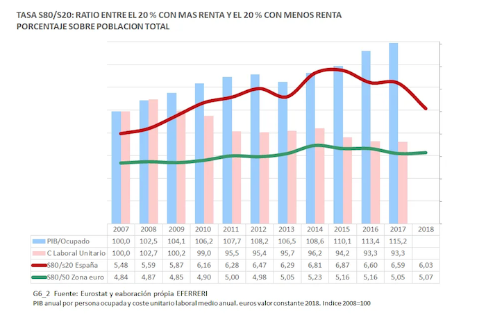 Una de las formas de medir la desigualdad entre la renta de los sectores más ricos de la población y los más pobres es la tasa S80/S20 que mide la relación entre el 20 por ciento de la población con más renta y el 20 por ciento de la población más pobre. España en 2007, con una tasa del 5,5, se situaba en el sexto país de la Unión Europea con mayor diferencia entre los dos sectores de población y en 2017 esta tasa de desigualdad ascendió hasta el 6,6, la segunda más elevada de la Unión Europea, solo superada por Lituania.