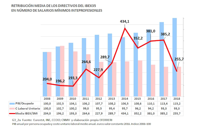 Finalmente, una tercera observación tiene que ver con las desigualdades internas en la distribución de las rentas destinadas a retribuciones salariales lo que se conoce como brecha de salarios. La retribución media de los directivos de las empresas del IBEX35 en 2008 era, según los datos de la CNMV, equivalente a 204 veces el SMI y en 2018 se había situado en 258 veces, después de pasar por un máximo de 434 veces en 2014. El directivo mejor pagado en 2019 percibió el equivalente a 1.326 veces el SMI. Entre 2008 y 2018 el SMI en euros de valor constante se incrementó el 8,8 por ciento y, sin embargo, la retribución media de los directivos aumentó 6 veces más, hasta el 53,8 por ciento.