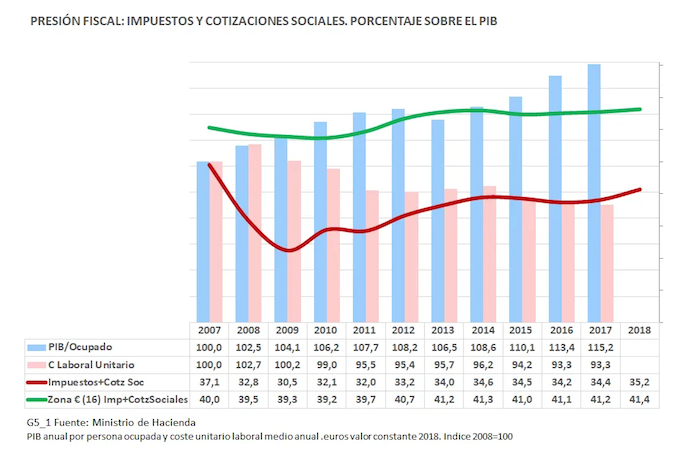 El sistema fiscal es una herramienta para corregir la desigualdad, es en este sentido un instrumento para la práctica de la equidad. El nivel de imposición y el grado de progresividad hacen aumentar o disminuir las divergencias en la distribución de la renta. En muchos casos en España el sistema impositivo actúa como un amplificador de la inequidad de la distribución de las rentas antes de los impuestos. Ello es debido, básicamente, a la continuada reducción de la presión fiscal, a la relación regresiva entre impuestos directos e indirectos, a la insuficiente progresividad y a su bajo nivel en relación con la media de la zona euro. En algunos de los gráficos adjuntos, además de la variable económica observada, se reproduce como fondo la evolución de la producción y el coste laboral medio con objeto de ofrecer una referencia del contexto.