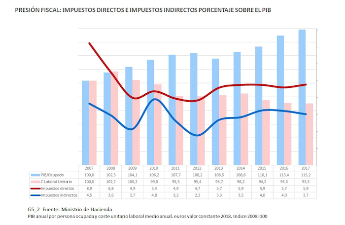 Por otra parte, la reducción de la presión fiscal ha ido acompañada de una creciente regresividad de su estructura. Aumenta la proporción de impuestos indirectos (los más regresivos: al comprar un yogur paga el mismo impuesto el que percibe el SMI, que el directivo del IBEX35 cuya remuneración equivale a 1.326 veces el SMI). En consecuencia, se reduce la proporción de impuestos directos. De tal modo que entre 2007 y 2017 la recaudación por impuestos indirectos disminuyó el 17,1 por ciento, mientras que la recaudación por impuestos directos que son más progresivos, disminuyó el 34 por ciento, el doble que los indirectos, con una disminución en la recaudación, en términos de euros de valor constante 2018, desde 95.990 millones de euros en 2007 a 63.44 millones de euros en 2018.