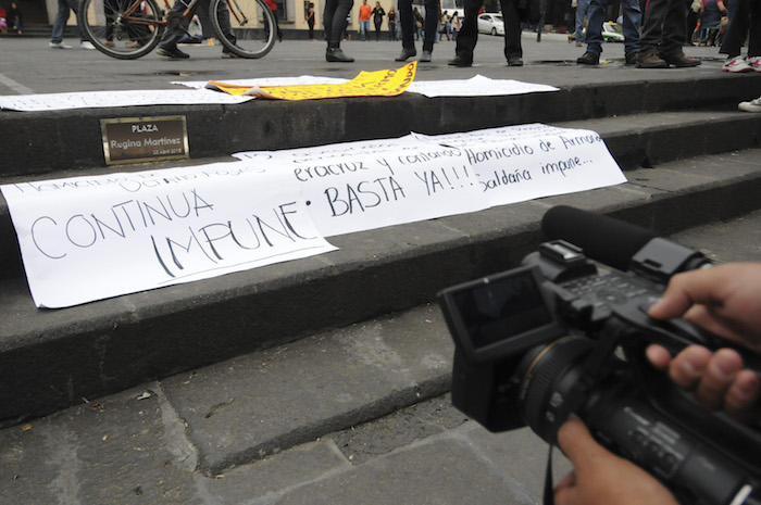 En la plaza “Regina” y a un costado de la placa de la reportera de la revista Procesoasesinada hace 13 años, colocaron las cámaras, libretas, lapiceros y grabadoras como símbolo de unidad y reclamo para que se detengan los crímenes contera el gremio periodístico.